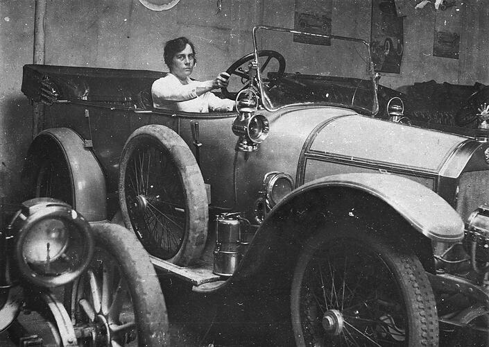A woman seated in a car. There are other cars to the right and left so this was probably taken in a garage.