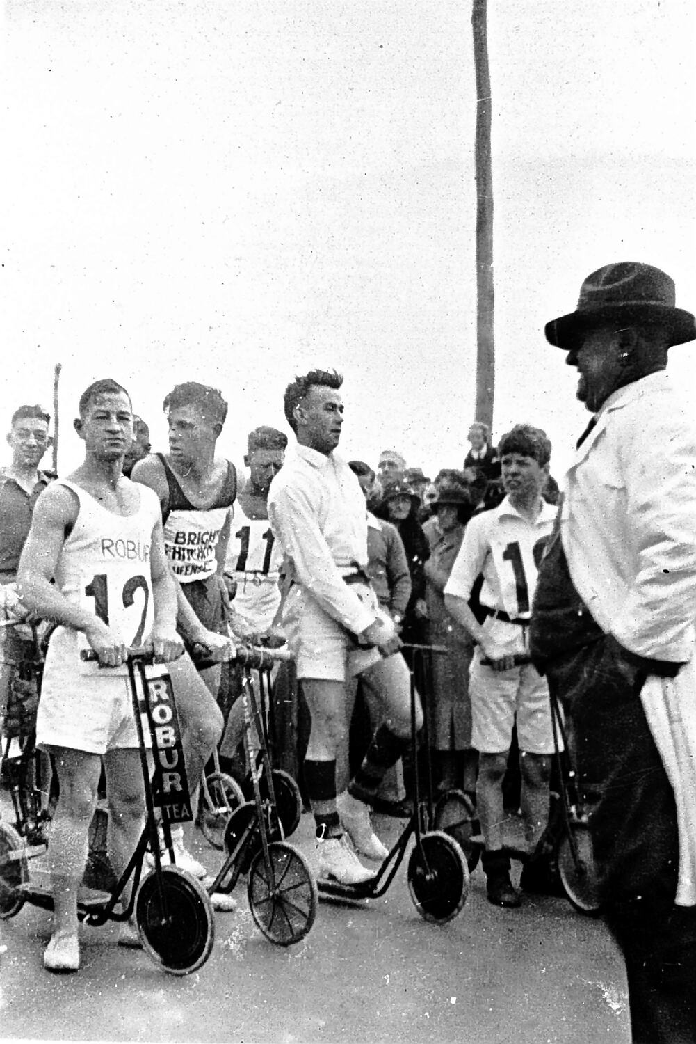 Men lined up as contestants in a scooter race at Geelong. They wear shorts and most have a numbered bib attached to their singlet or shirt. One of the competitors has a sigh on his scooter and bib that reads 'Robur Tea'. An official wearing a hat and long white coat stands at the right with his hands in his pockets. A crowd of onlookers are gathered in the background.