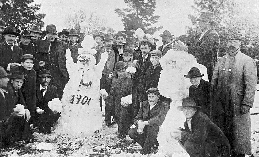 A group of men and boys standing with a couple of snowmen. The snowman on the left has been decorated and carries the date '1901' on its front.