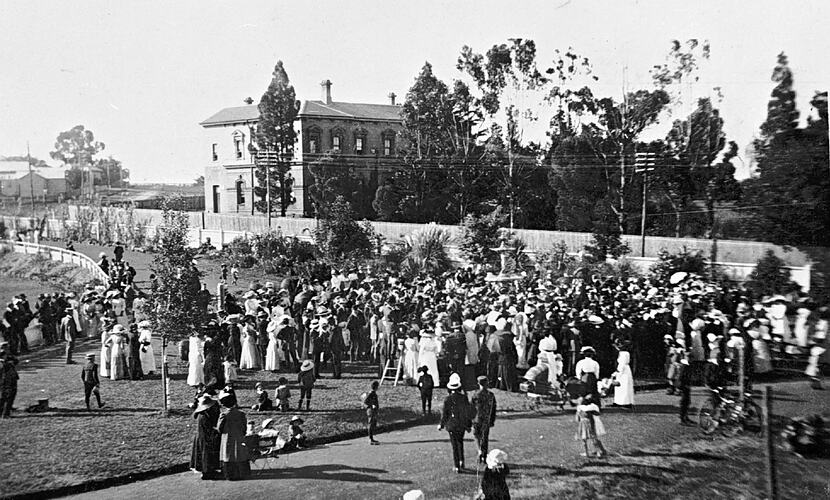 The crowd at the opening of the temperance fountain in Melville, 1905-1915.