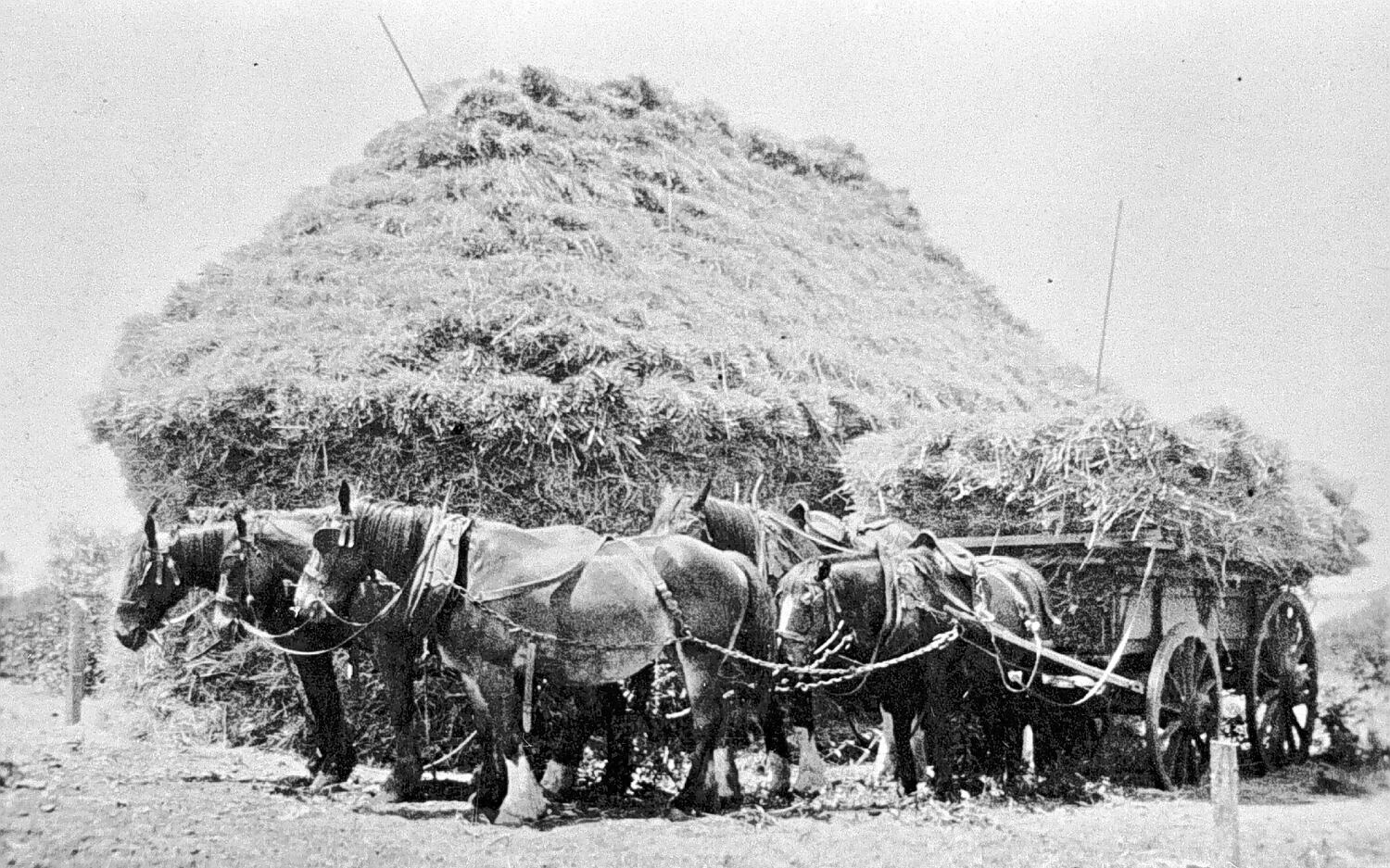 Unloading hay at a haystack. This is Tom Runnalls ' five horse team. (See also MM 002187-2189.).