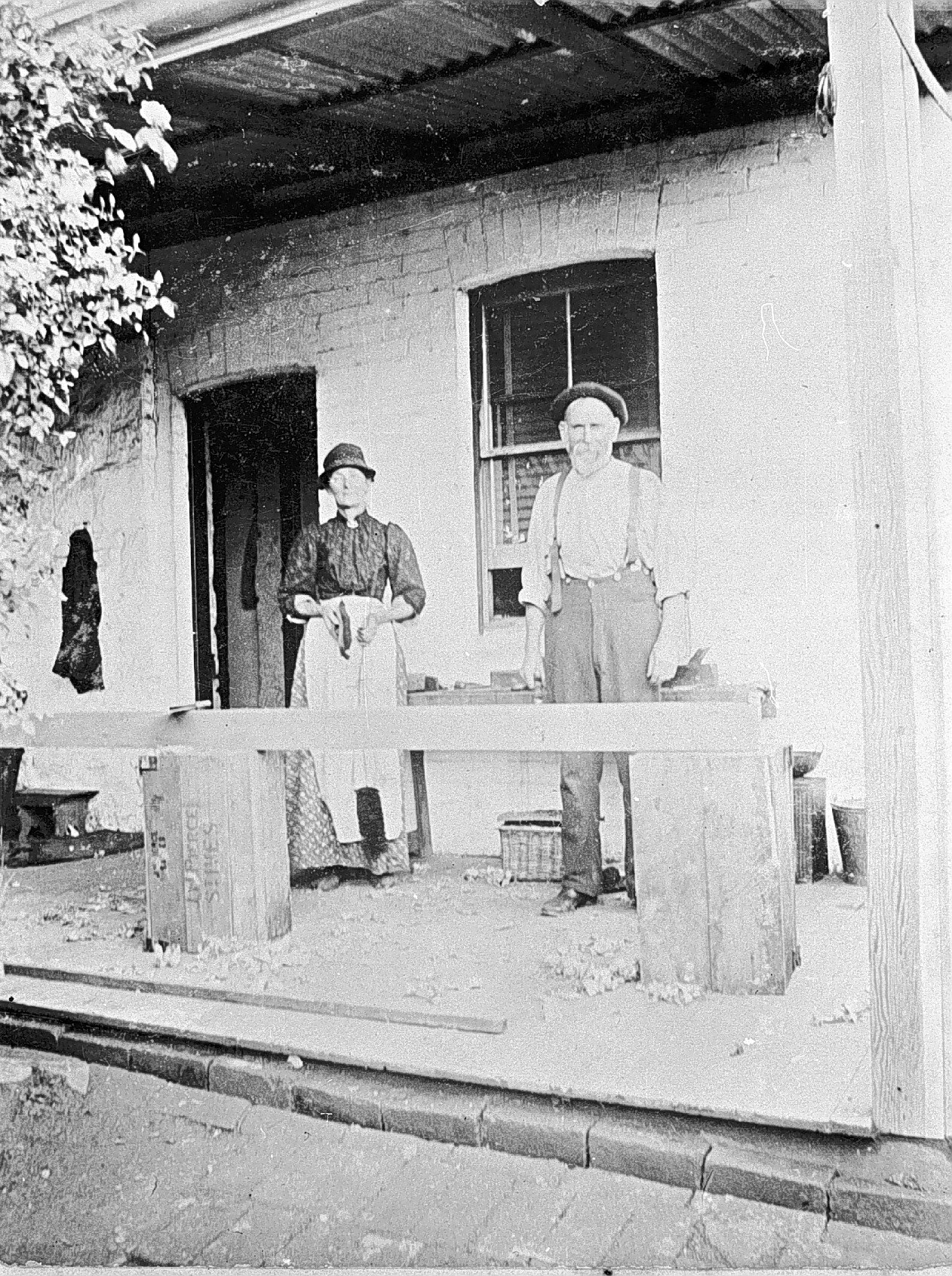 A man and a woman at back of a house. The woman wears a hat and a long apron, the man is in shirt sleeves; he also wears a hat.