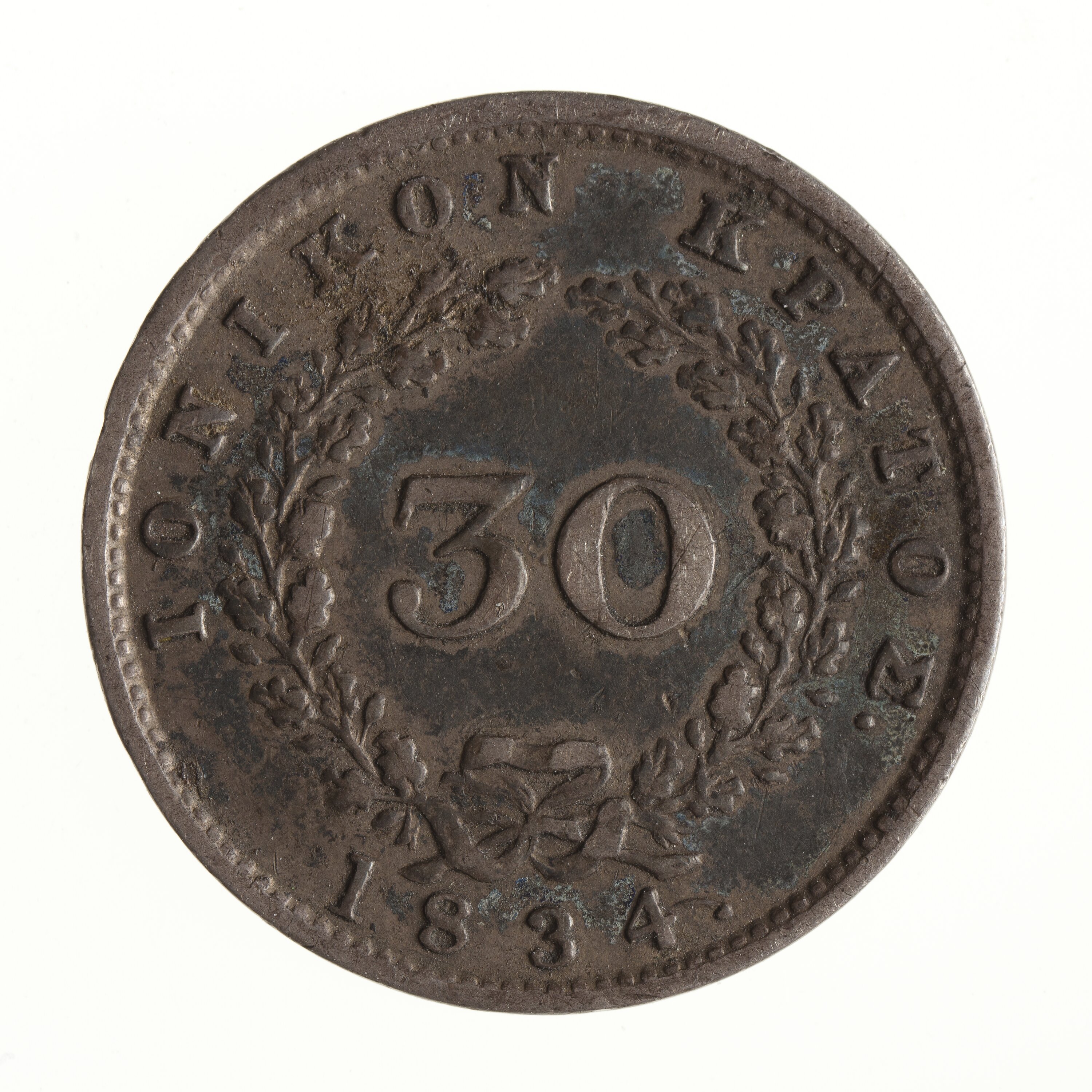 At centre within an oak wreath, 30; around above in Greek, IONIKON KRATOS; below, 1834.