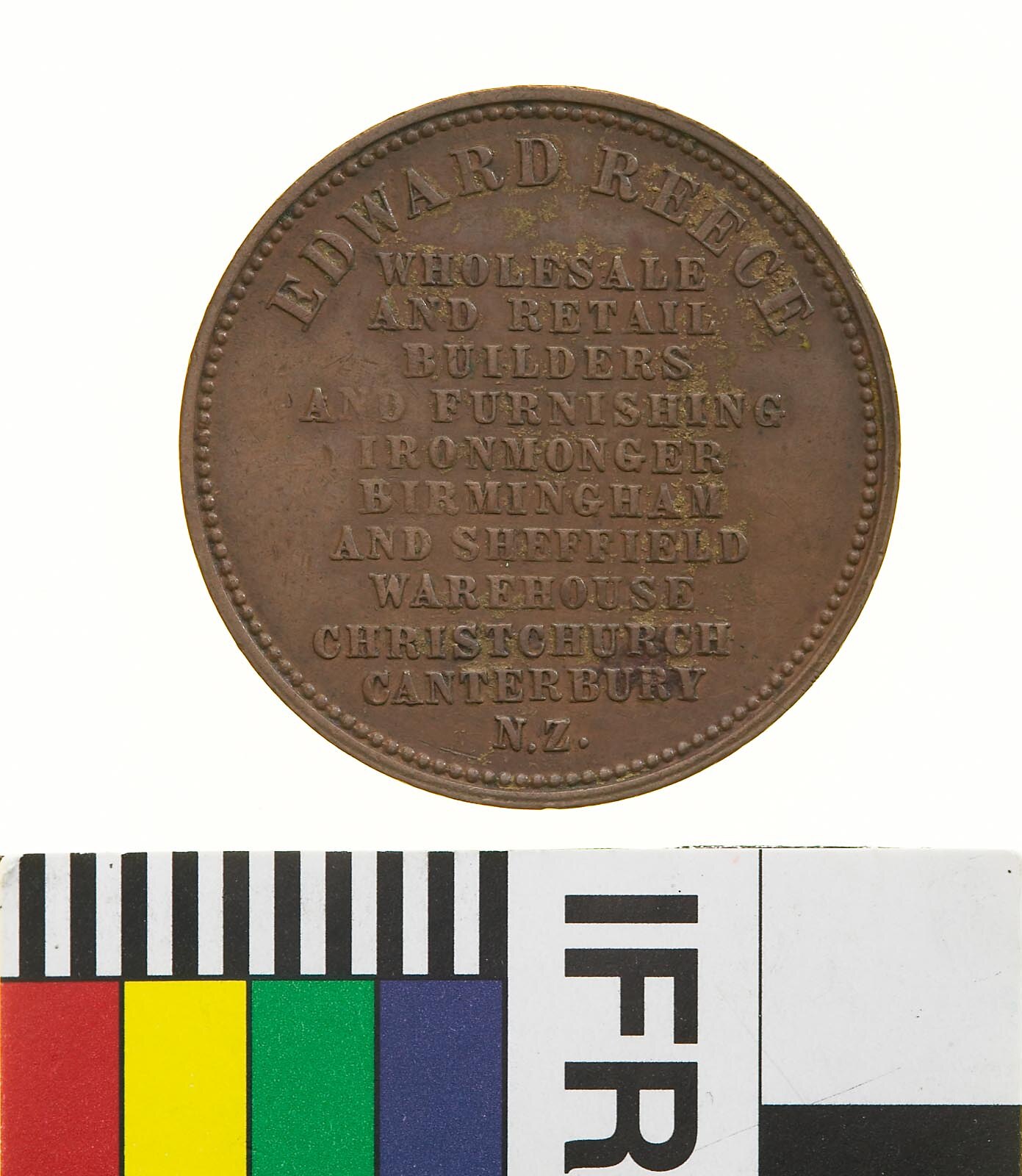 Obverse: EDWARD REECE WHOLESALE AND RETAIL BUILDERS AND FURNISHING IRONMONGER BIRMINGHAM AND SHEFFIELD WAREHOUSE CANTERBURY N.Z. Reverse: ADVANCE CANTERBURY NEW ZEALAND