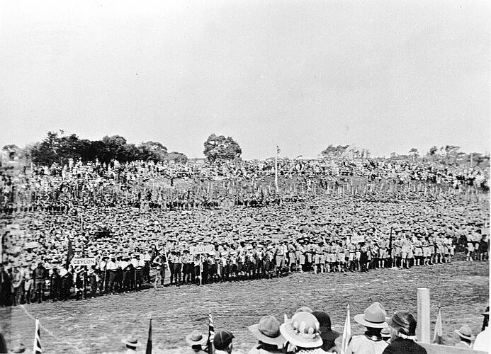The massed assembly of scouts at the World Scout Jamboree at Frankston. The groups are holding up signs on which is written the name of their place of origin, such as 'Fiji' and 'Ceylon'.