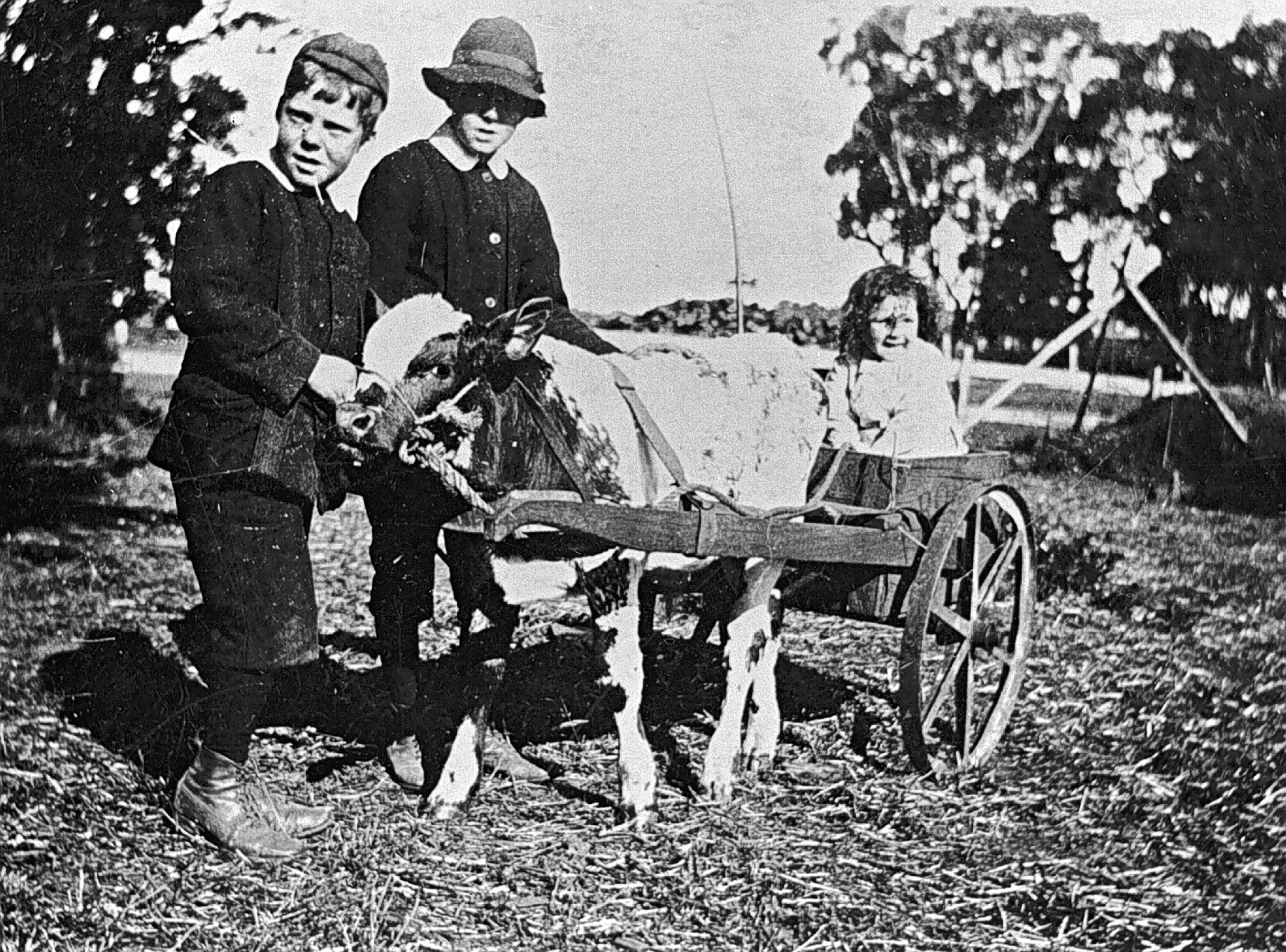 Three children with calf yoked to a cart. The young boys are wearings hats and boots typical of the Edwardian era.