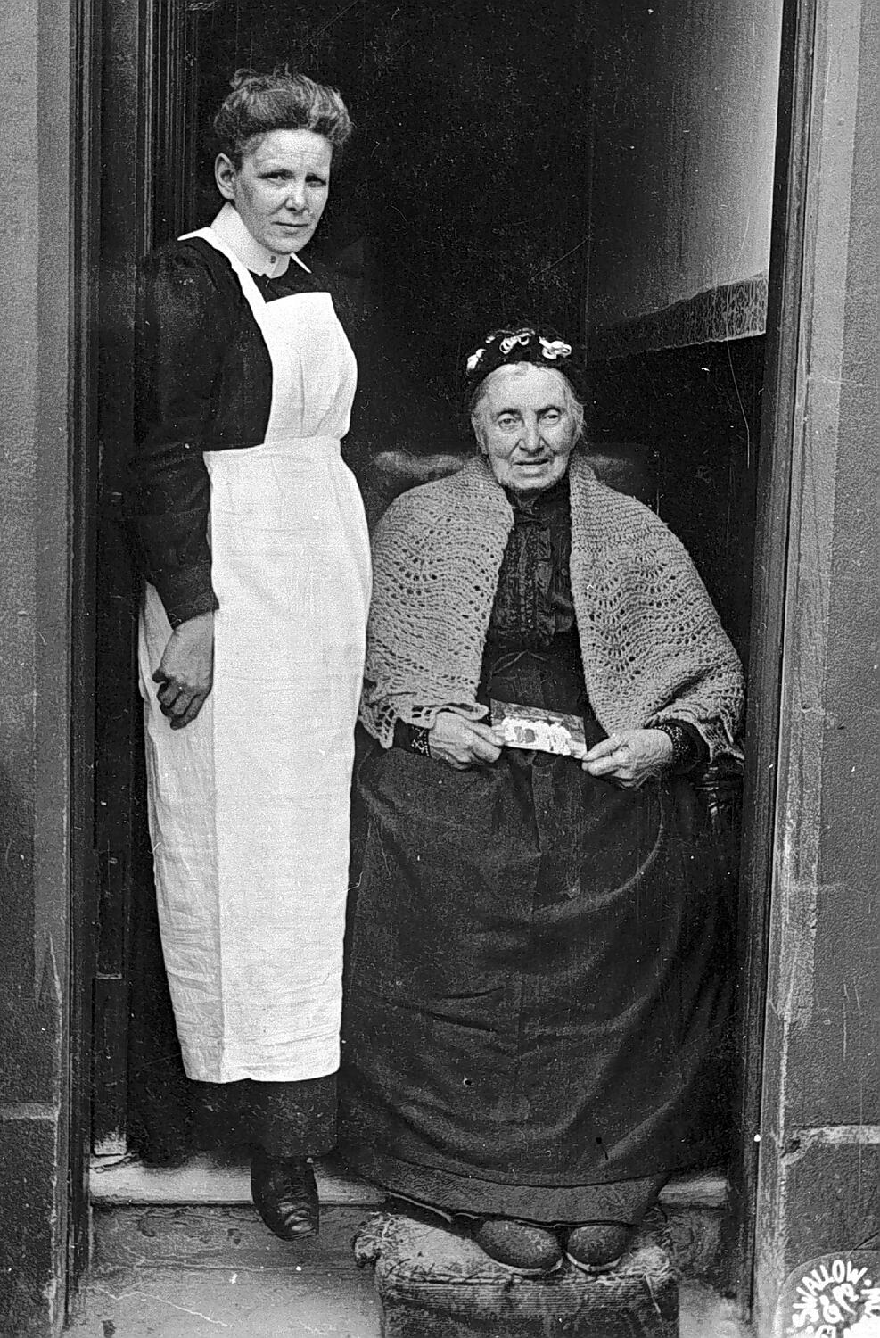 Mary Haig seated in the doorway of her family home. She holds a photograph. A nurse stands beside her.