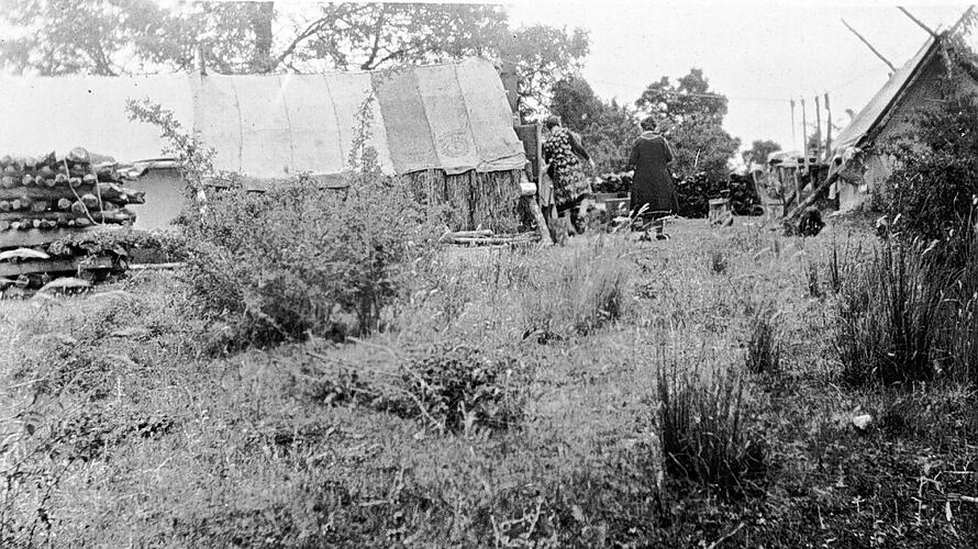 A mining camp: sleeping tent on left, store tent on right. The tent in the centre was made out of cut down potato sacks. Timber on the left was used to prop up mining tunnels.
