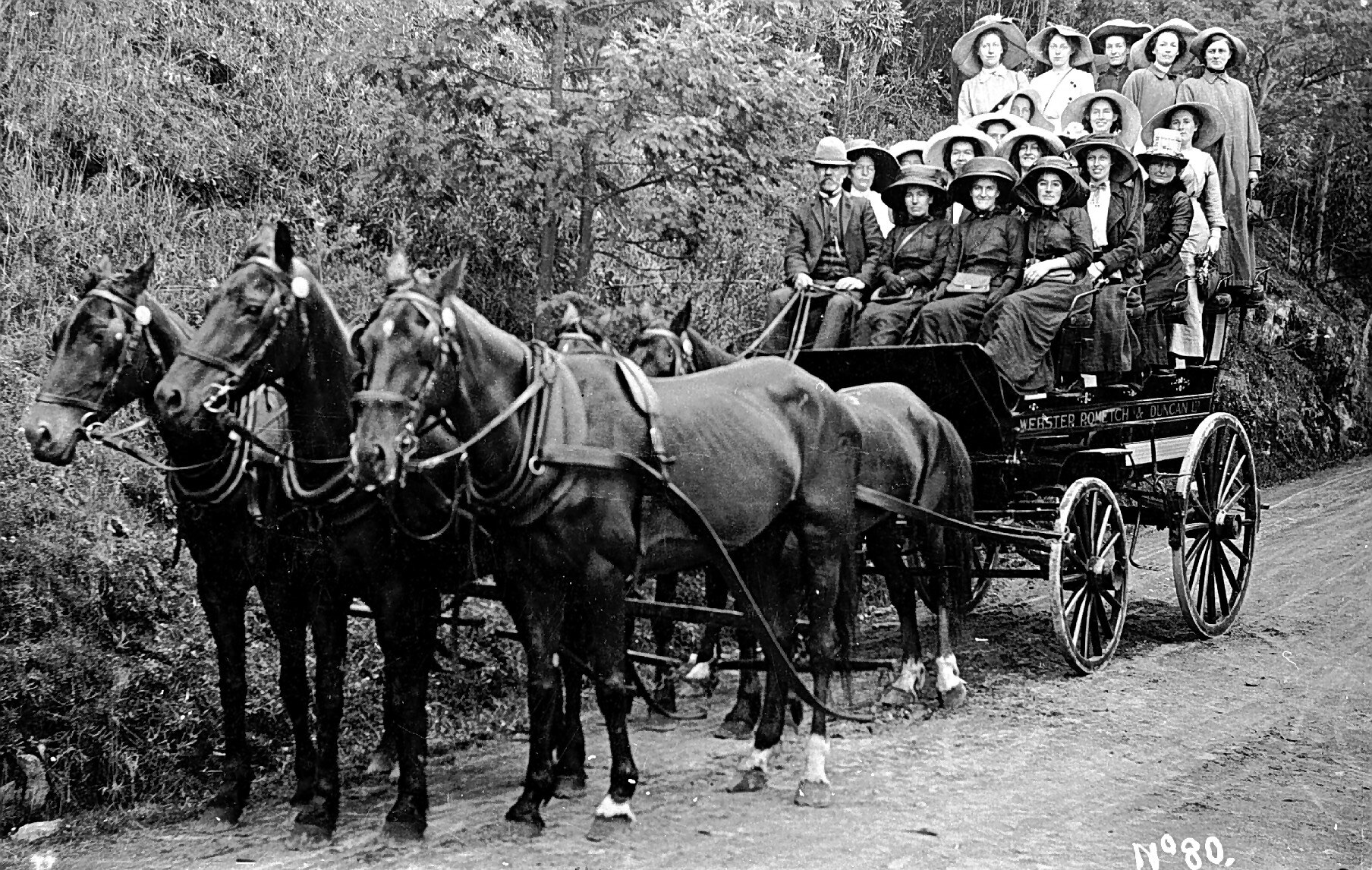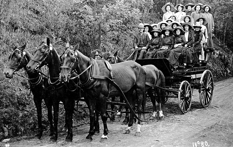 A large group of women descending Mt Wellington in a horse-drawn carriage.