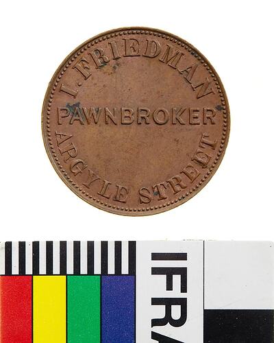 Copper Halfpenny Token, minted by W.J. Taylor, London. Issued by I. Friedman, Pawnbroker, Hobart, Tasmania, in 1857. Isaac Friedman, was living in Hobart by 1840 and commenced business as a shopkeeper and general Pawnbroker in 1843. He had married Maria Nathan in 1842 and they had eight children, all born in the Hobart area, between 1842 and 1858. Friedman was a significant person in the Hobart Jewish community, in 1842, he kept a public house where the meeting was held that led to the construction of the Hobart Synagogue. His name is recorded on a tablet inside the Synagogue as one of the members of the Hobart Hebrew Congregation's committee in 1843.