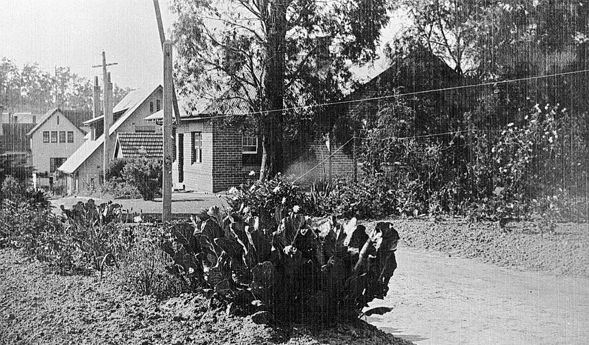 A street scene and garden in Daylesford with a large cactus in the foreground.