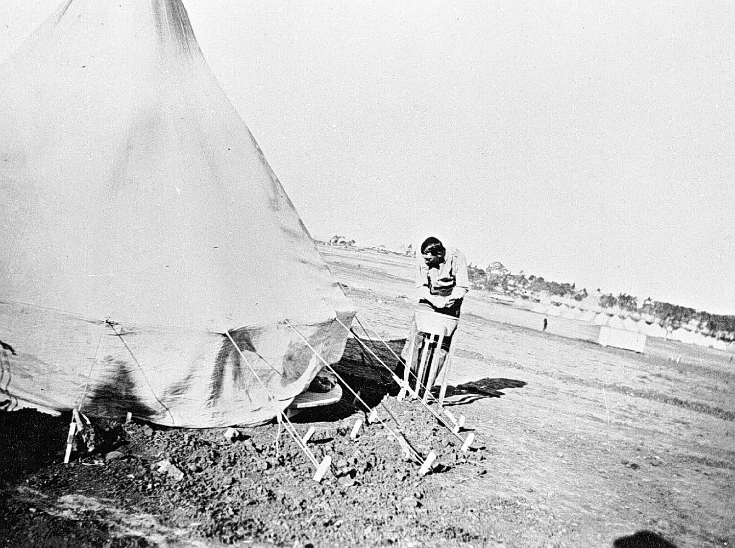 Soldier of the Australian Army Service Corps washing in a basin outside tent, Broadmeadows, June 1916.