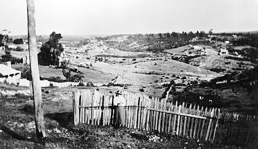 Looking across open country towards Daylesford. A woman is standing in front of a picket fence in the foreground.