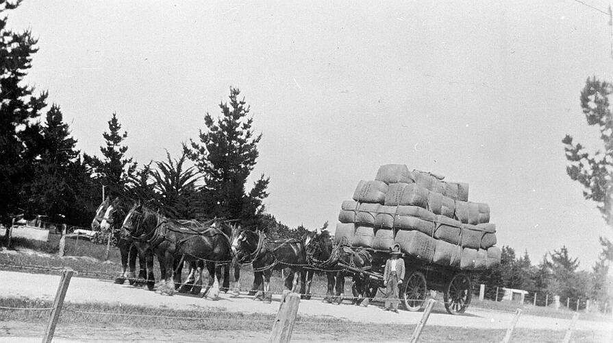 A horse team pulling a dray laden with wool bales. They are on their way to Windermere Railway Station and then to Dennys Lascelles, Geelong.