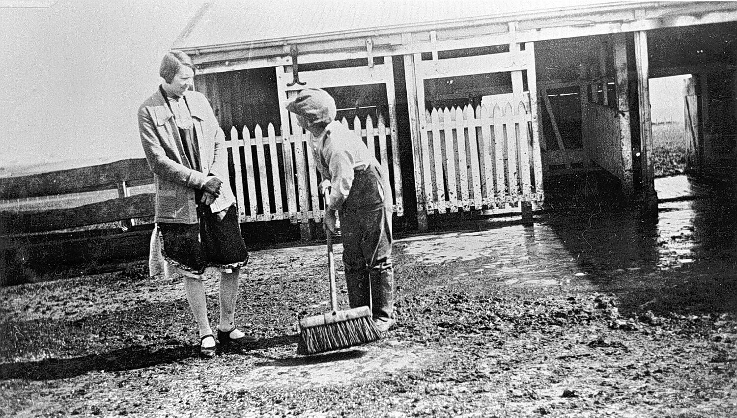 A woman talking to a young boy who is cleaning out the dairy and cow shed.