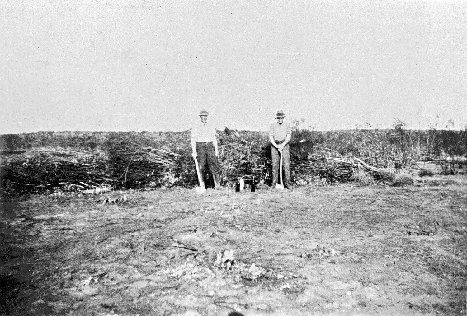 Clearing farmland. The men are chopping 'springbacks' after the Mallee has been rolled.