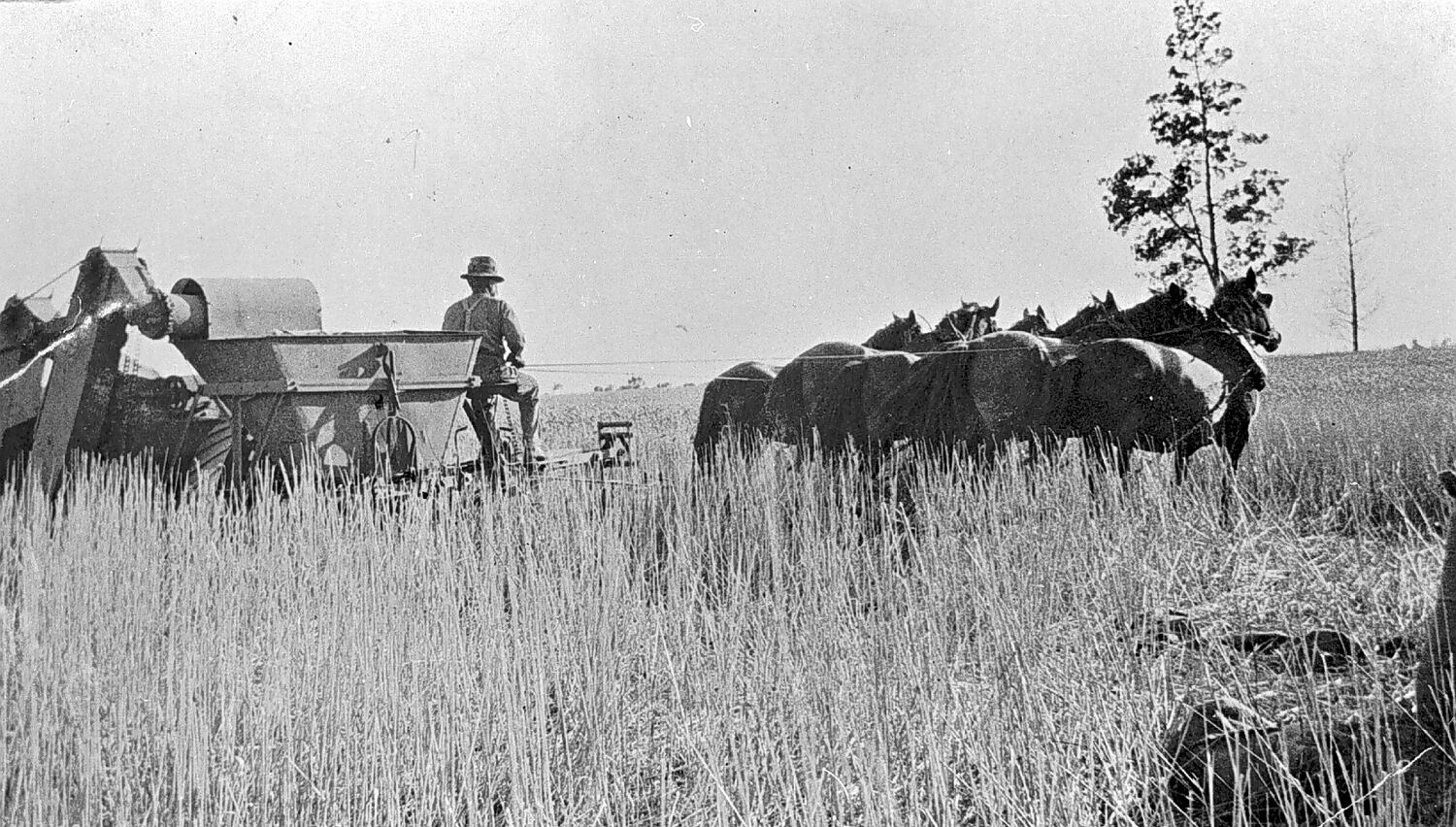 Horse team and harvester.