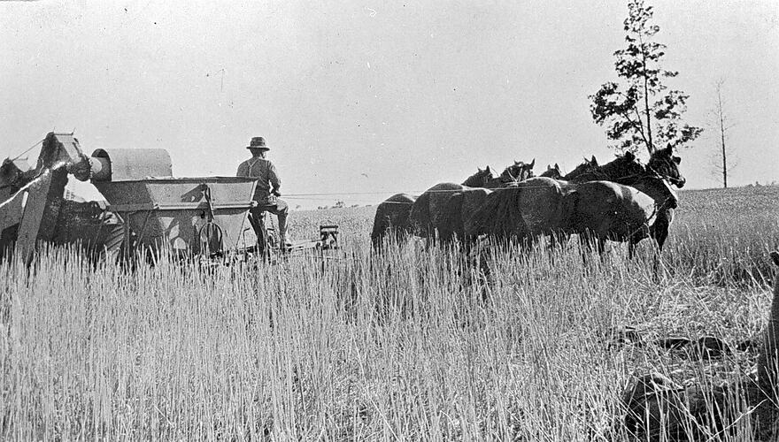 Agricultural Equipment, Agricultural Workers, Farms, Harvesters, Horses, Wheat, Workers
