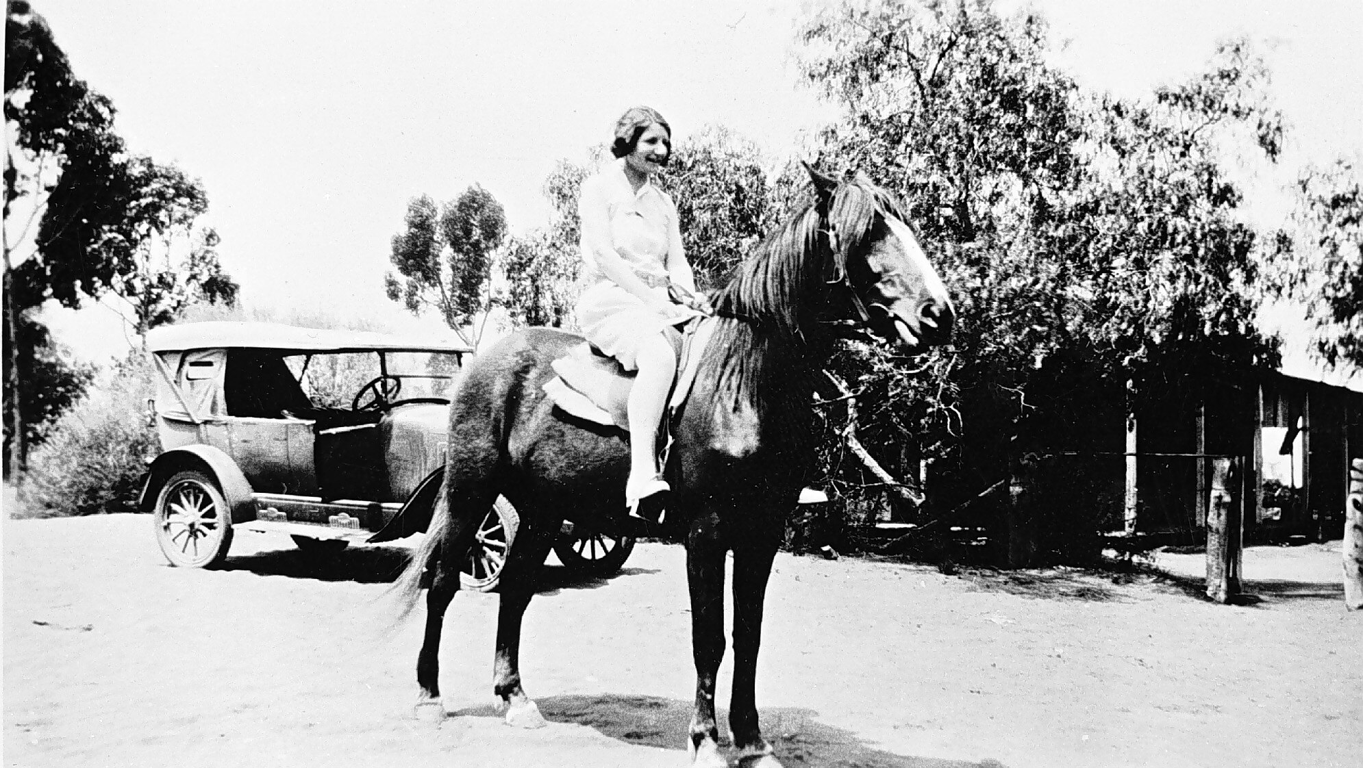 A girl on horseback. She wears a dress and is bare-legged. There is a car in the background.