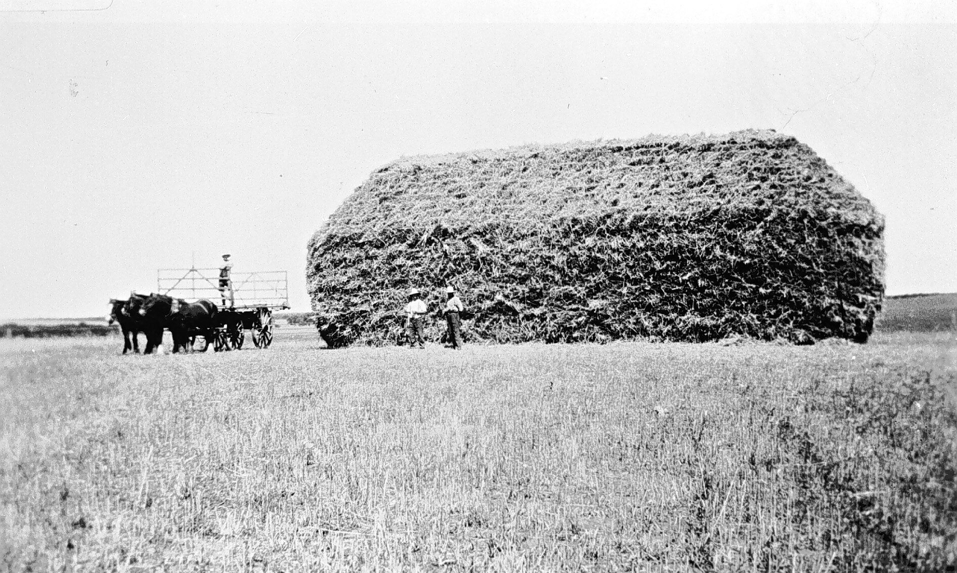 A large haystack in a field. There is a horse-drawn wagon on the left.