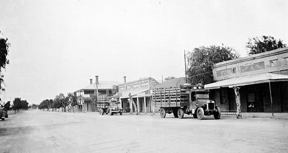 The main street in Wilcannia with two trucks carrying sheep.