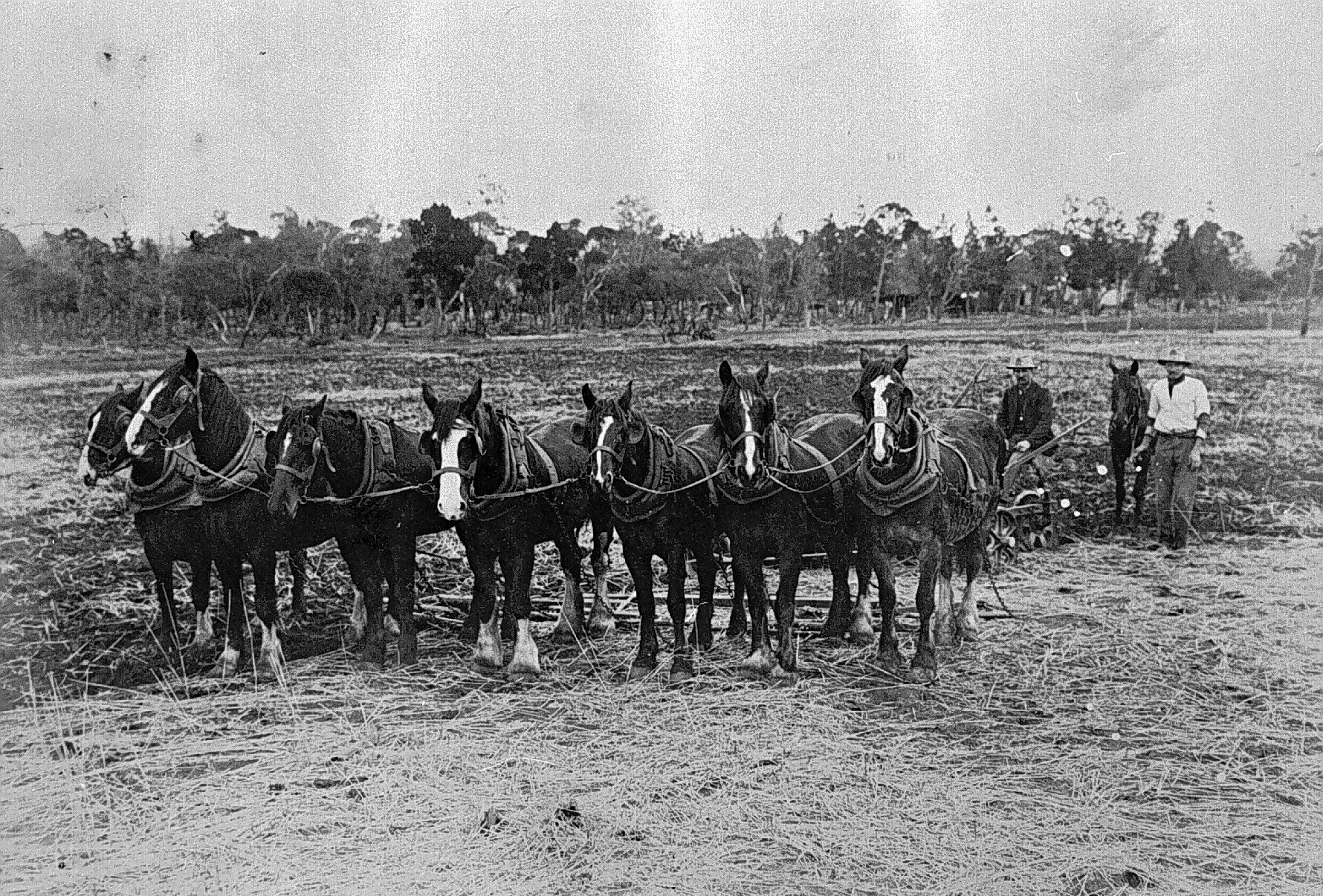 A team of seven horses ploughing a field.