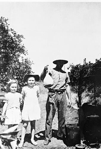 A man and two small girls. The man holds up a plum pudding which may be about to go into one of the containers on the right.