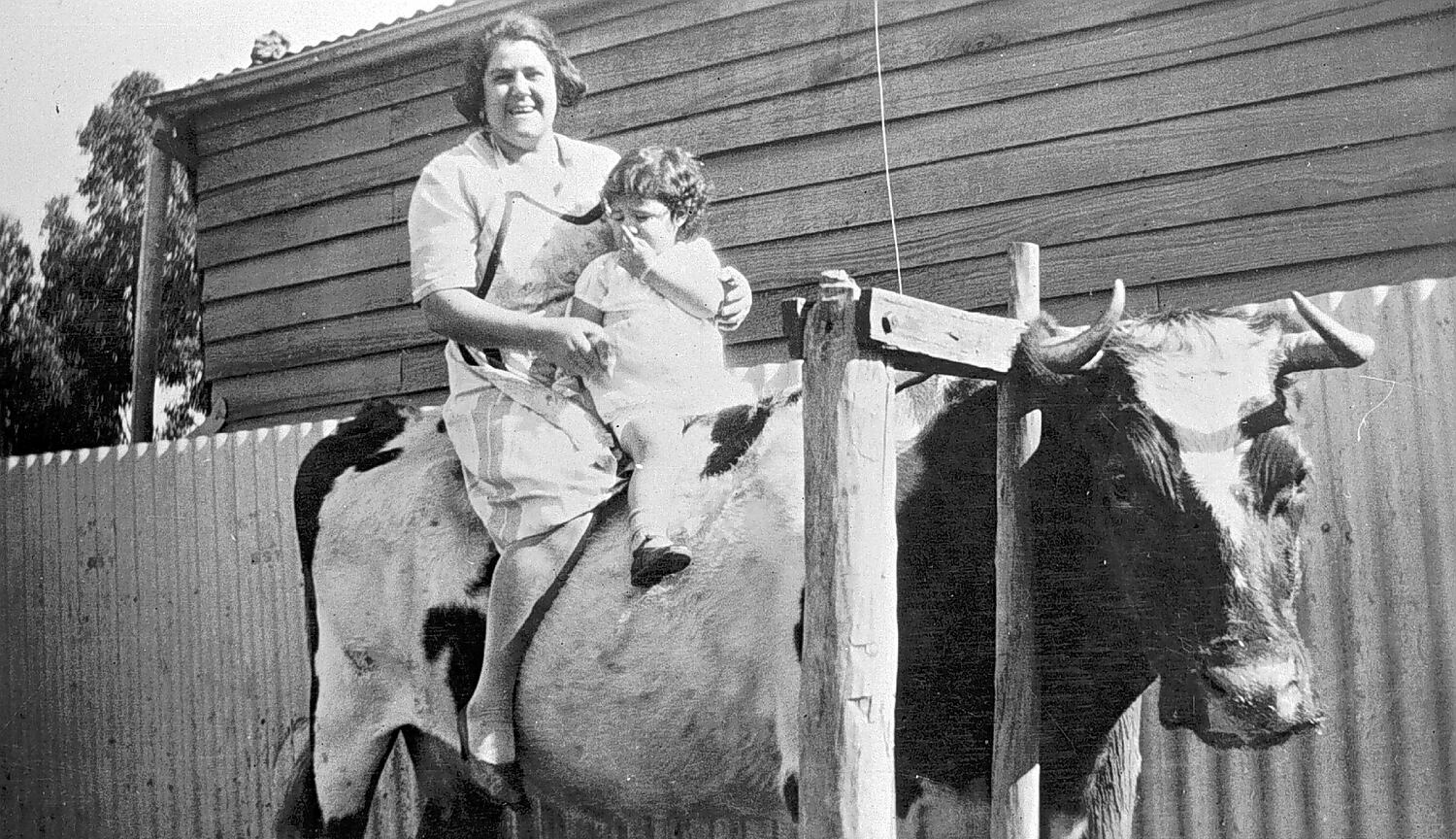 A woman and child on a cow in a milk bale.