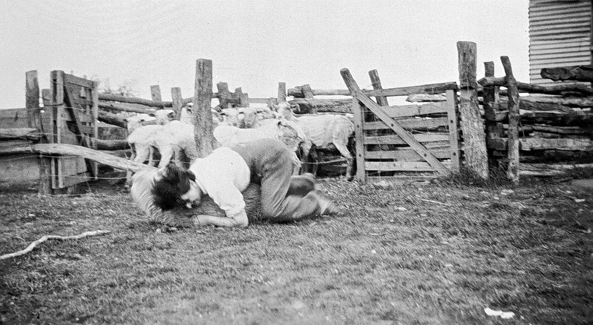 Rose Raphael catching a sheep. She is kneeling on the ground and holding the sheep down.