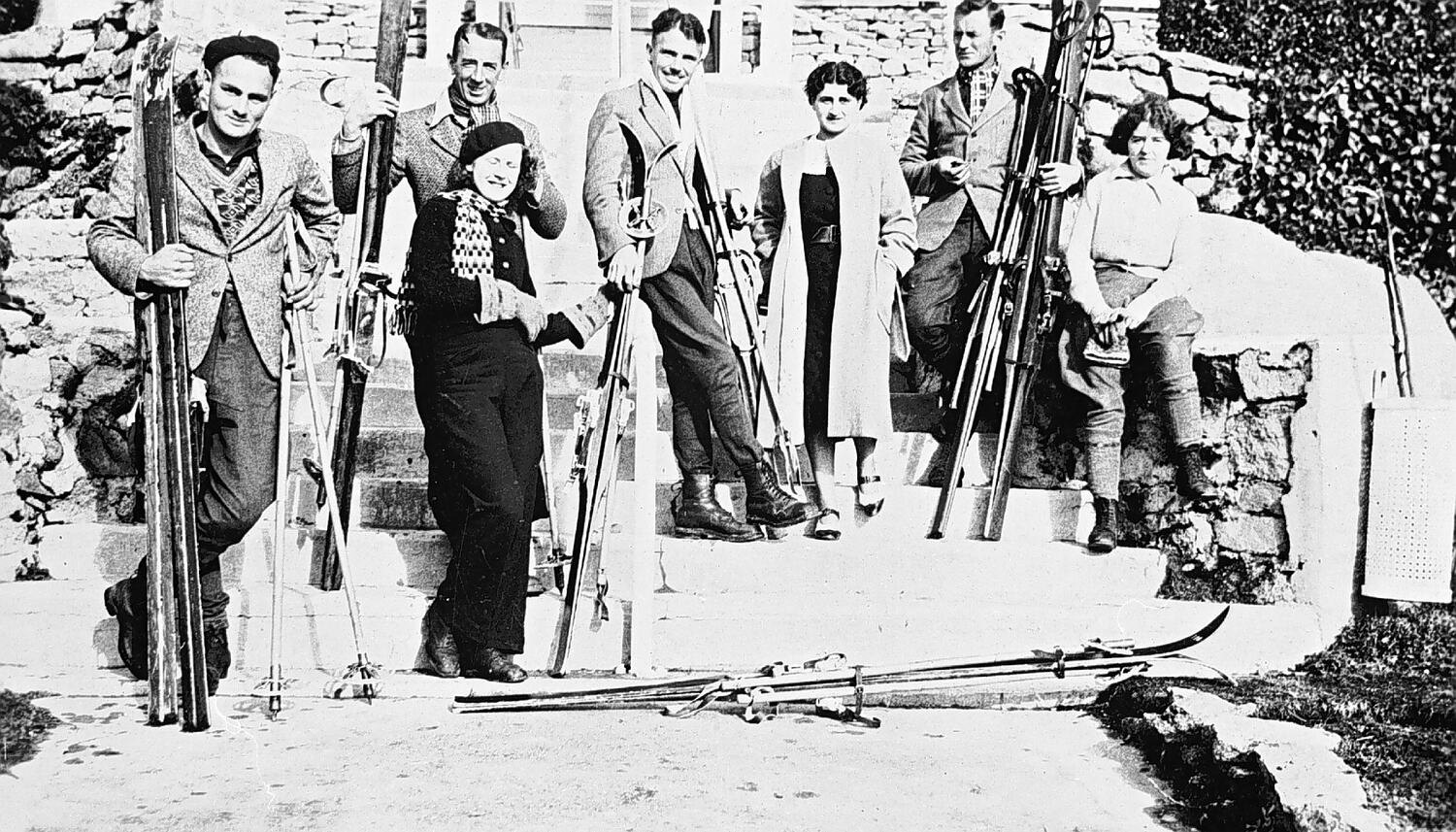 A group of people with skis. Six appear to be dressed for skiing, the other wears strapped shoes and a top coat.