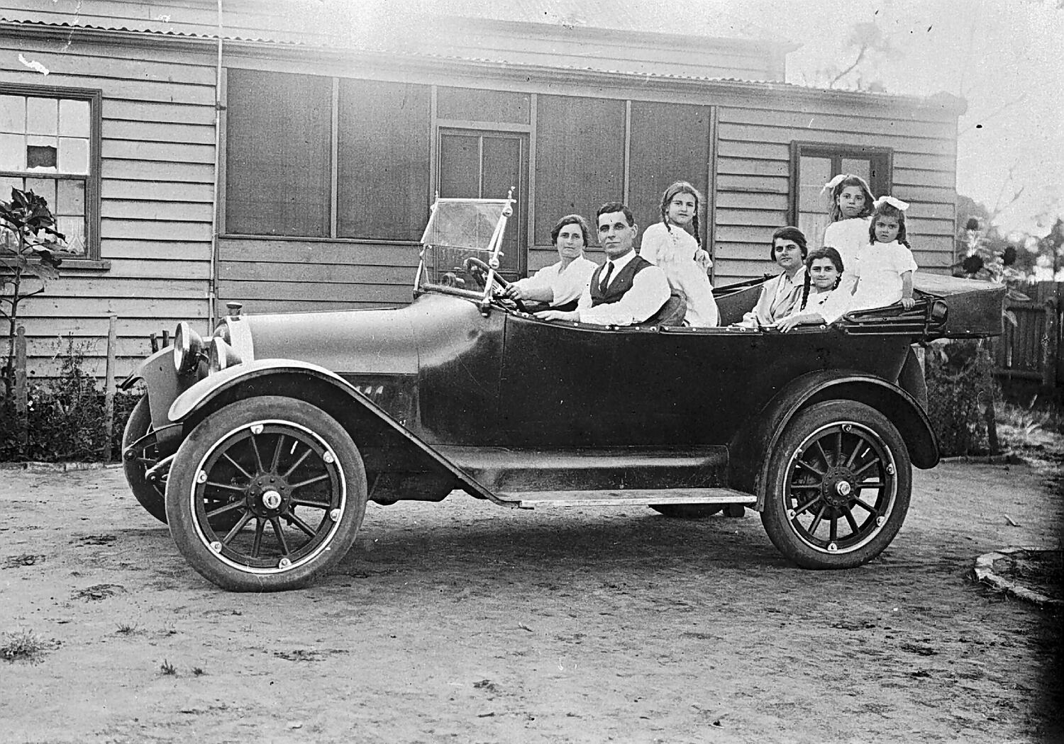 The Raphael family in their motor car. The weatherboard family house is in the background. There are five girls in the family.
