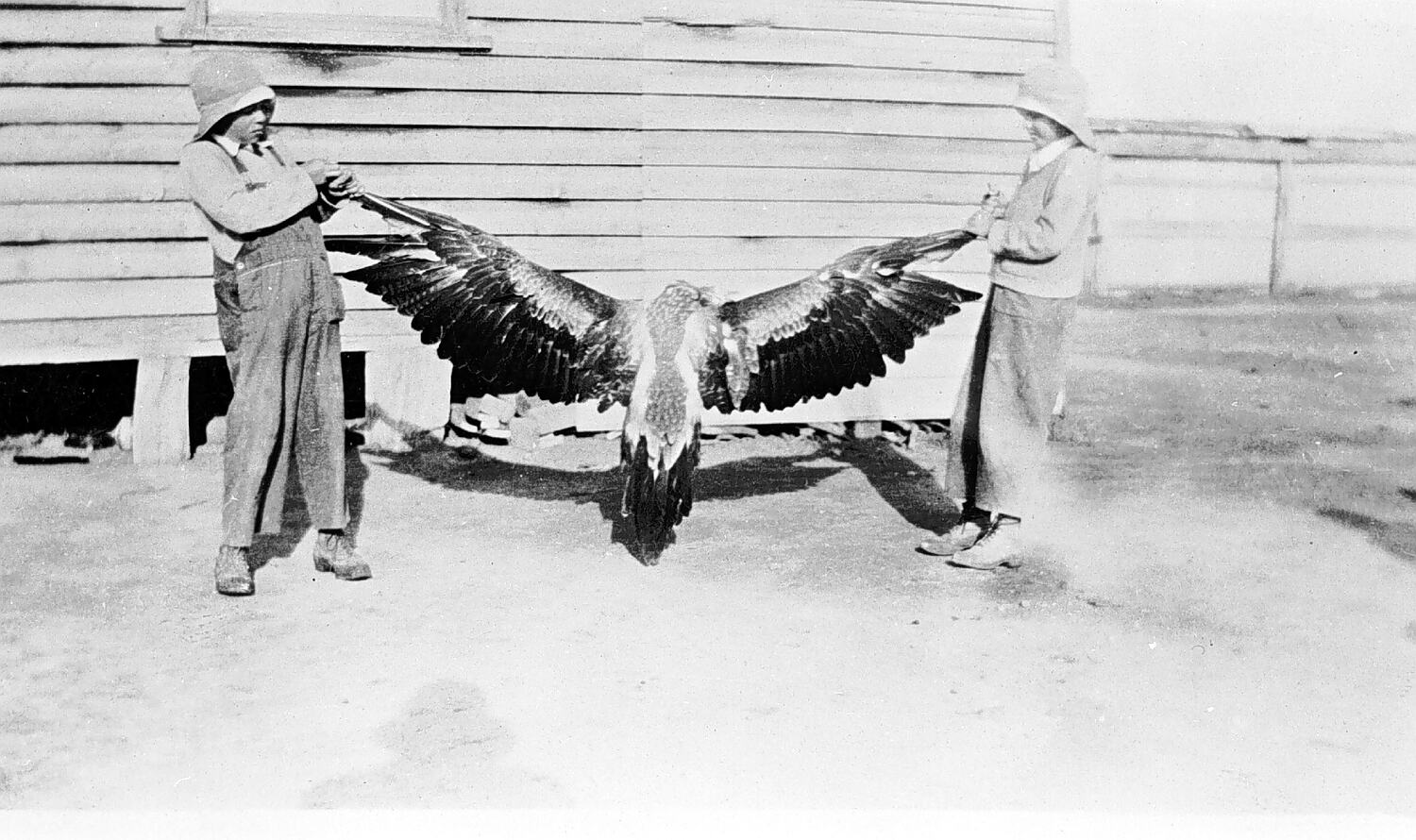 Two young boys holding up an eagle by its wings.