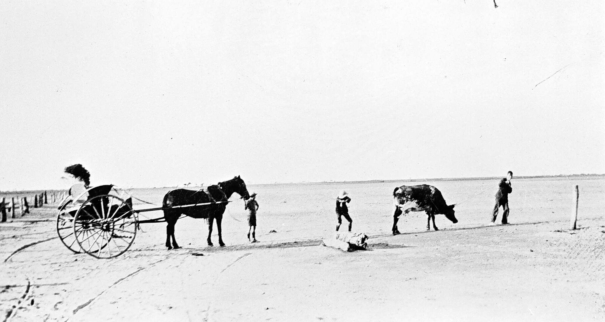 A flat plain with a horse and buggy on the left and two men with a cow on the right.