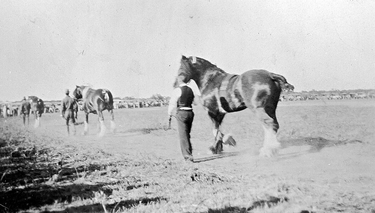 A group of men with rifles at a hare hunt. There is a car on the right.