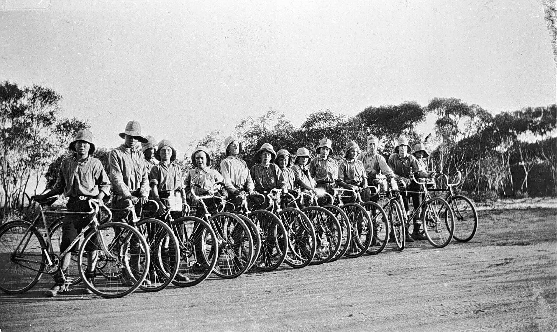 Boys on a cycling trip from Manangatang to Melbourne. 2. The cyclists lined up across the road.