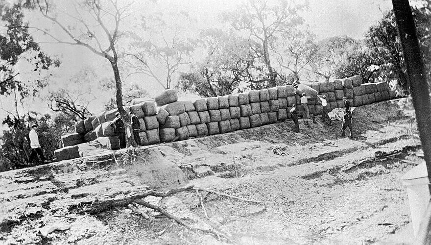 Bales of wool on the river bank about to be loaded onto a barge. The photograph has been taken from the barge.