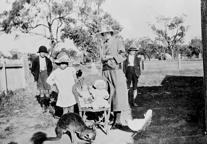 A woman and small girl stand on either side of a chair which contains two dolls. A galah and a magpie sit on the back of the chair. There are two young boys standing a little behind and a pet kangaroo and a hen in front.