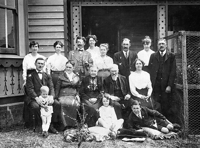 The Elijiah family outside their home. They are formally posed and wearing fine clothes for the photograph. It appears to be the rear of the house.