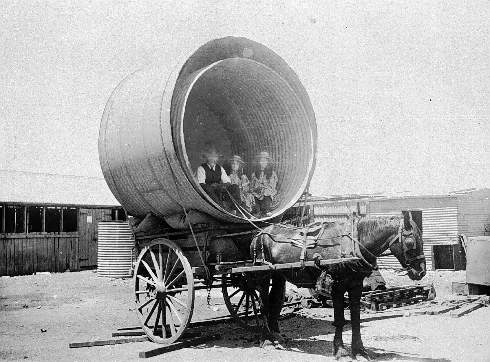 A man and two women seated inside two large tanks on a wagon drawn by a horse. These tanks were to be used to mix cow feed at the overland dairy, Trafalgar. This was the first dairy in the Kalgoorlie area.