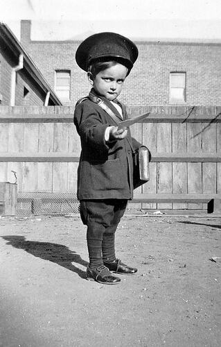 A small boy dressed as a postman. The White Swan Hotel is in the background.