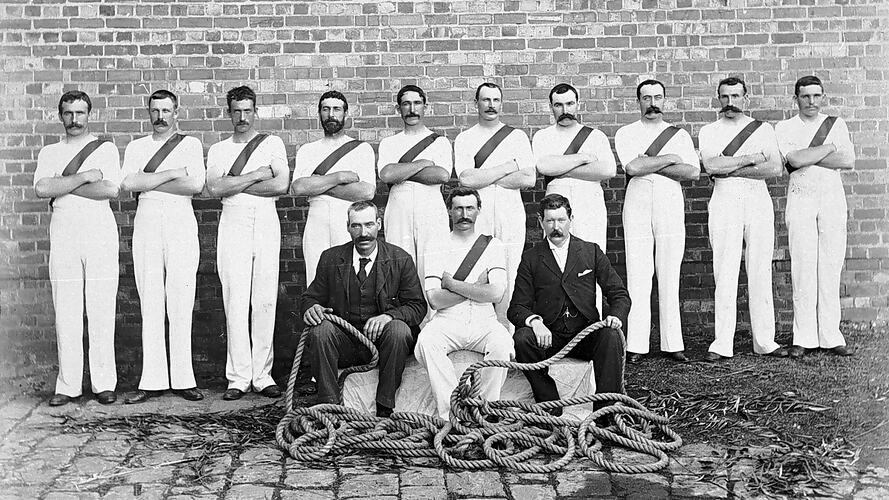 Monochrome photograph of tug-of-war team, Gisborne, Victoria. From the O'Donnell family album of photographs which was copied by Museums Victoria under the Biggest Family Album project in 1987.