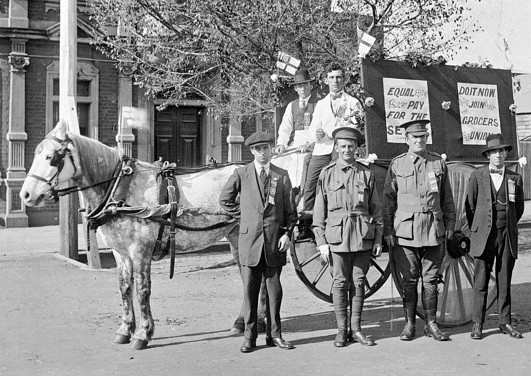 Grocers with a parade float. Signs on the float read: 'Equal pay for the se(? - word is obscured)' and'Do it now, join grocers' union'. Two of the men standing in front of the float are in army uniform.
