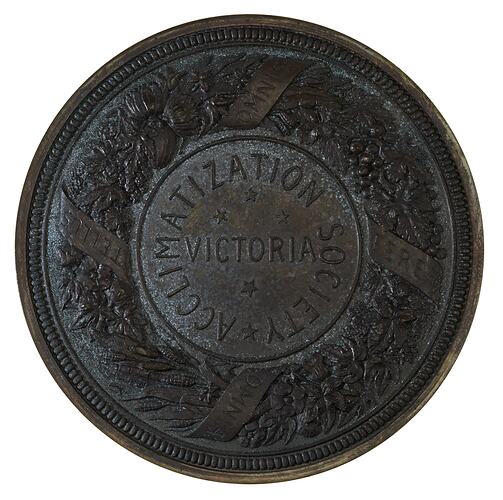 At centre, across four stars of the Southern Cross, VICTORIA; around, ACCLIMATIZATION SOCIETY * around the centre a wreath of imported plants (including graoe vines and wheat) bound with ribbon inscribed, OMNIA TELLUS OMNES FERET