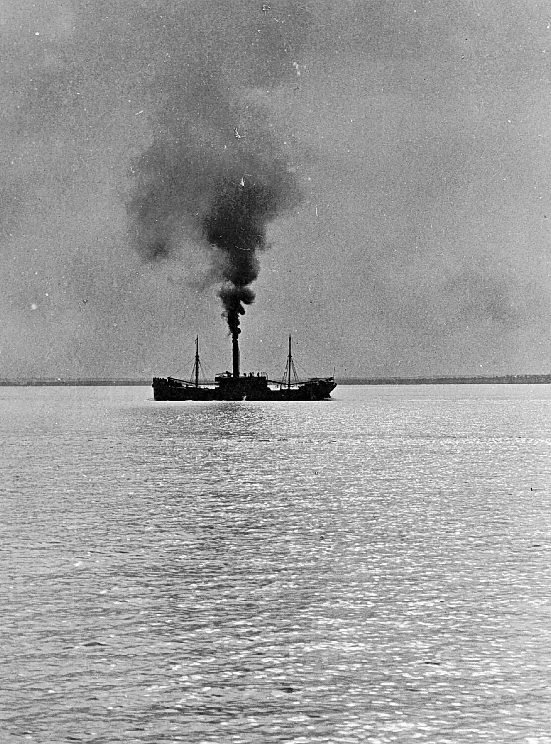 A ship in the bay in very still conditions (the smoke from the funnel is vertical).