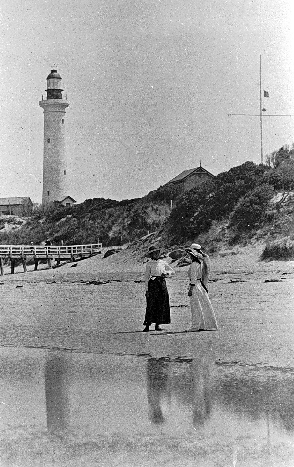 Three women on the beach with the Point Lonsdale lighthouse in the background. The women are wearing hats and dresses typical of the Edwardian era.