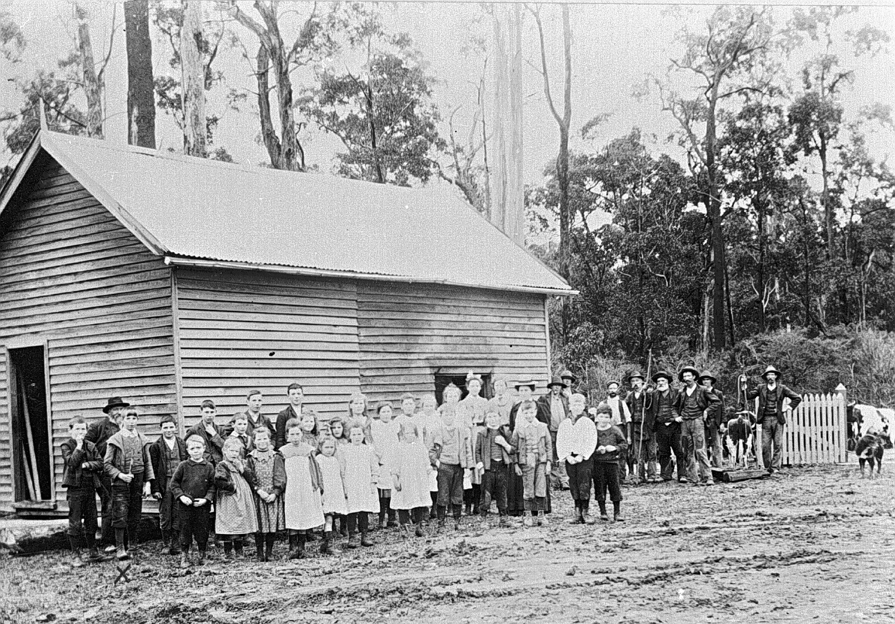 Pupils and adults outside the Budgeree School. The school had been moved by a bullock team. There is a wooden fence to the right.