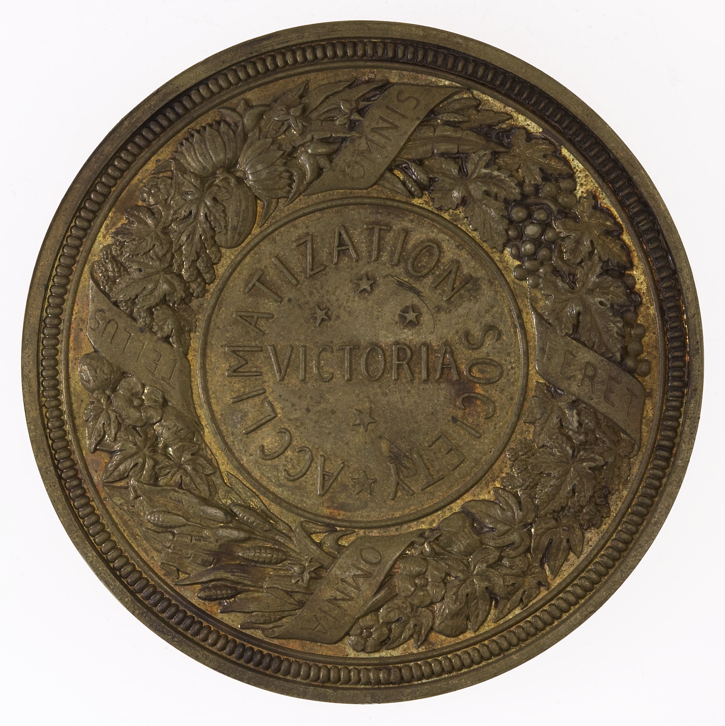 Obverse: ACCLIMATIZATION SOCIETY VICTORIA OMNIA TELLUS OMNES FERET Reverse: J.S. & A.B. WYON SC. 1868 T. LANSEER A.B.A. ADJ.