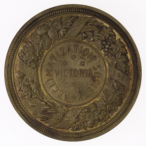At centre, across four stars of the Southern Cross, VICTORIA; around, ACCLIMATIZATION SOCIETY * around the centre a wreath of imported plants (including graoe vines and wheat) bound with ribbon inscribed, OMNIA TELLUS OMNES FERET