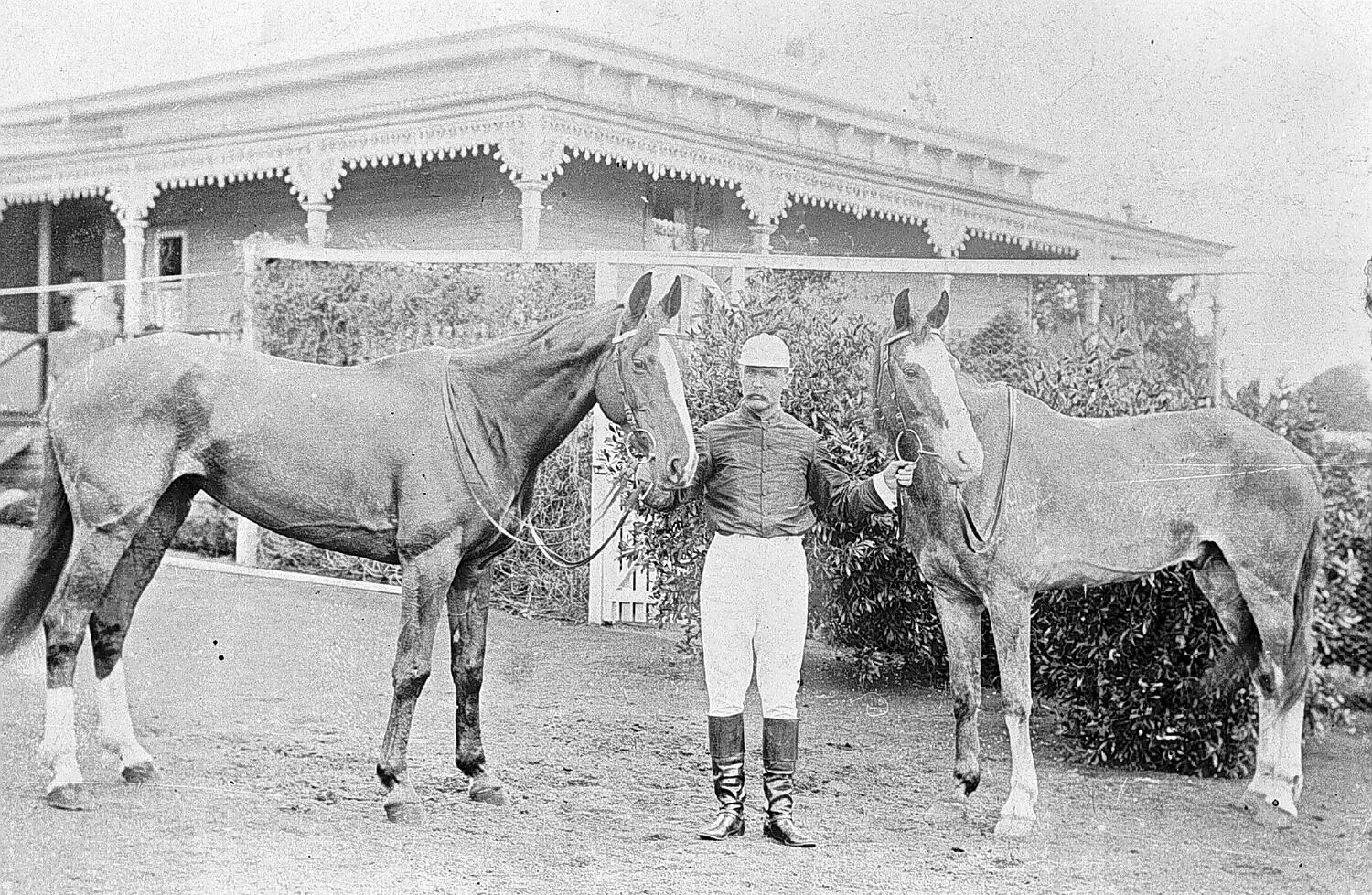 A man in jockey 's clothing holding two horses. The horses'Goodwood' and'Curiosity' had won 5 mile steeplechases.