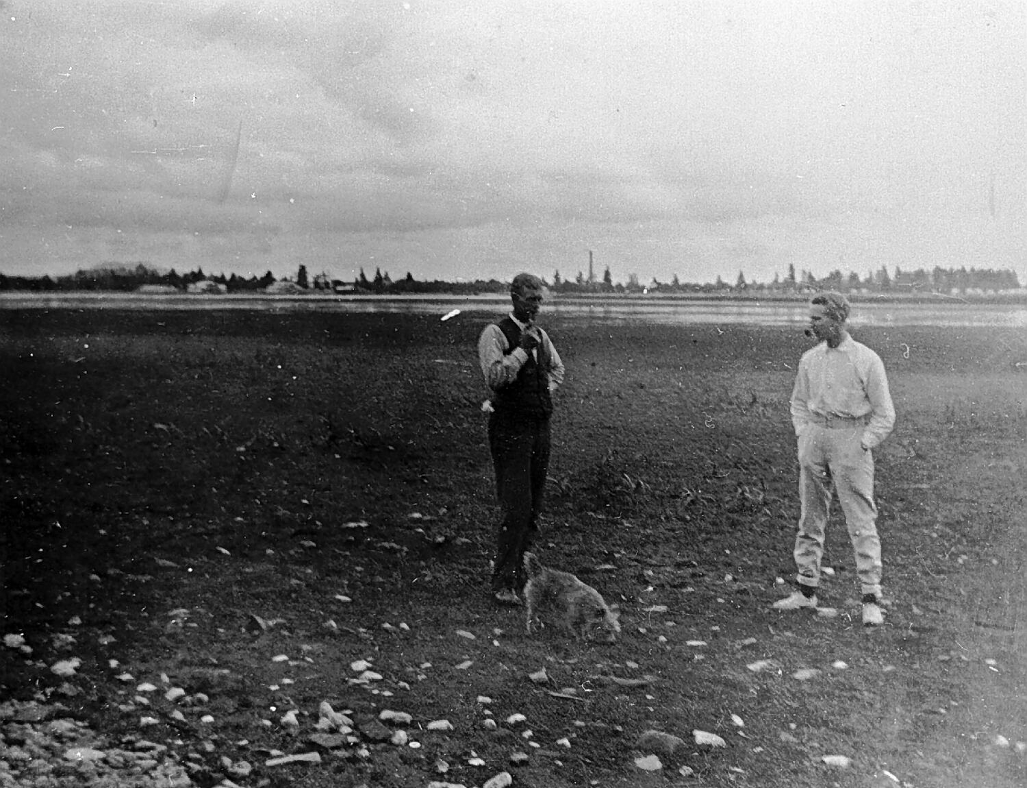 Two men and a dog standing in Lake Wendouree during a drought.